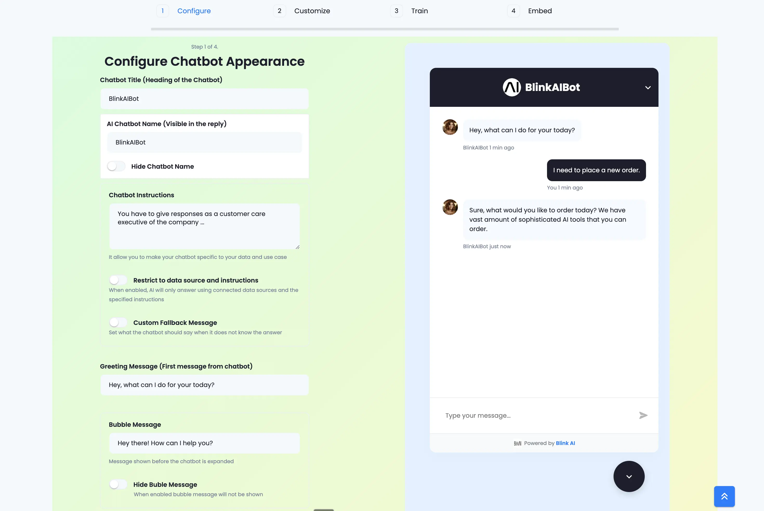 Step 1 of 4: Configure Chatbot Appearance – Set up the basic appearance and behavior of your chatbot. These options let you personalize how the chatbot looks and responds to your users.