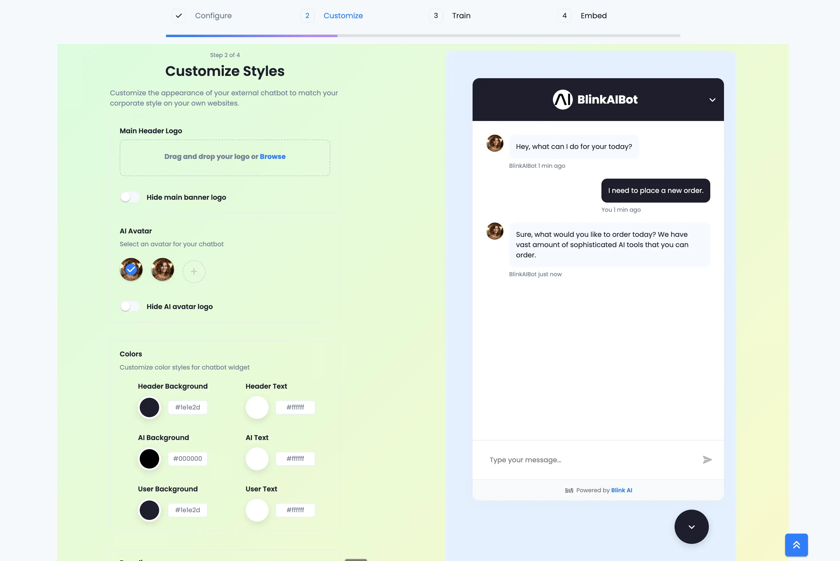Step 2 of 4 : Use Customize Styles to adjust the appearance of your external chatbot so it matches your company’s branding and design style. This ensures your chatbot blends seamlessly with your website.