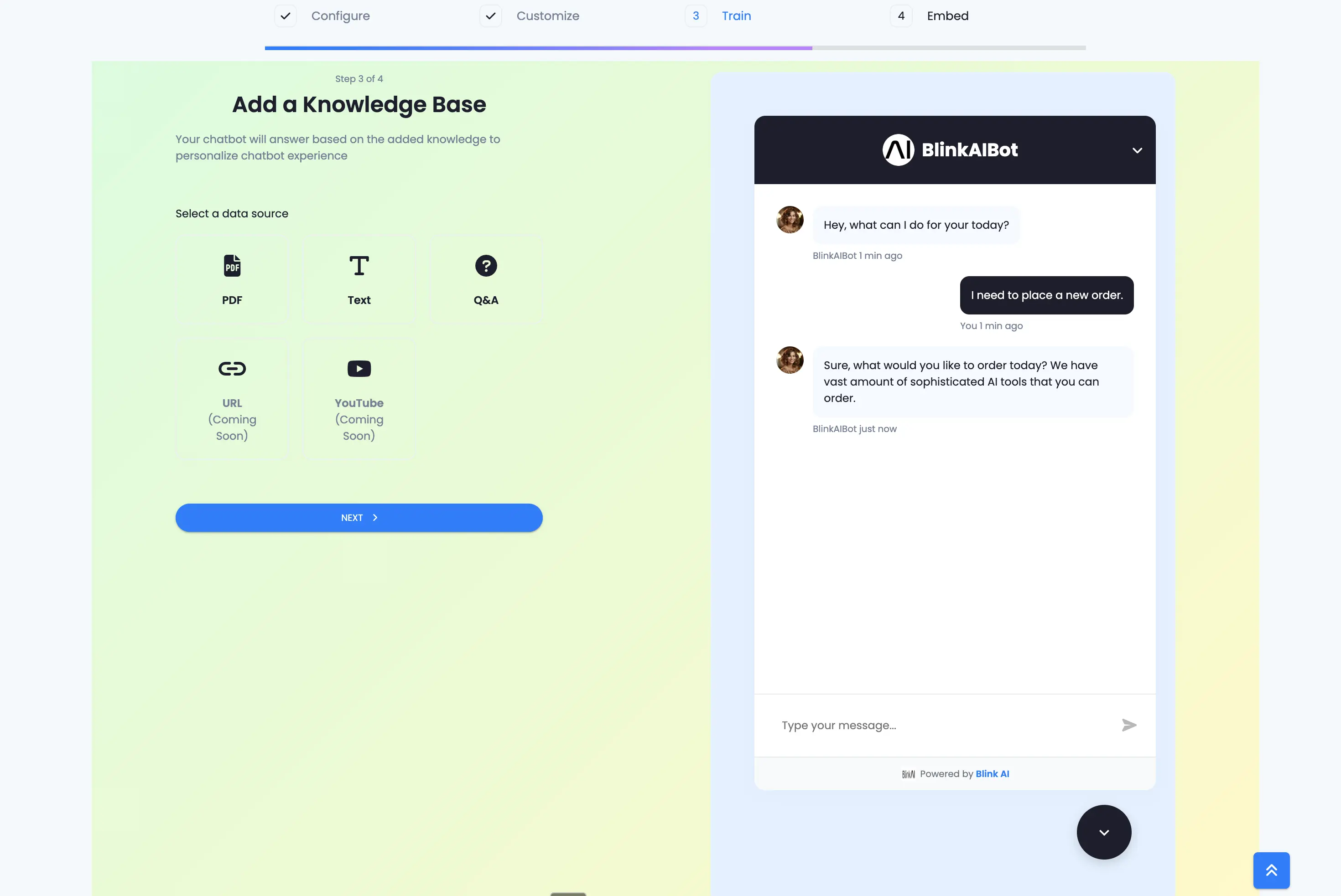 Upload documents and integrate with your website. Blink AI learns from PDFs, URLs, Text, Question and Answers to provide accurate responses.