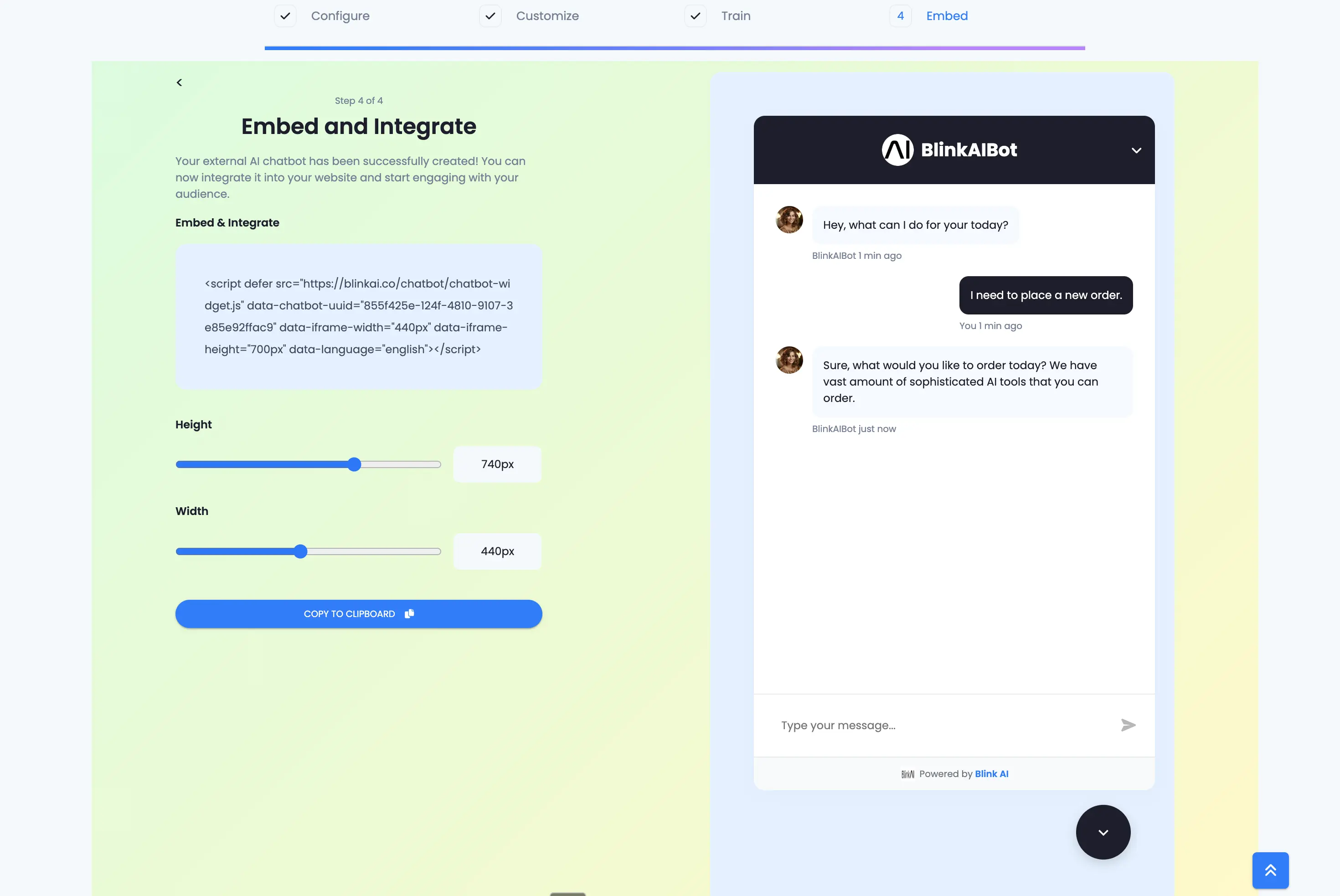 Step 4 of 4: Embed and Integrate – Your external AI chatbot has been successfully created! Now you can easily integrate it into your website and start engaging with your visitors in real time.